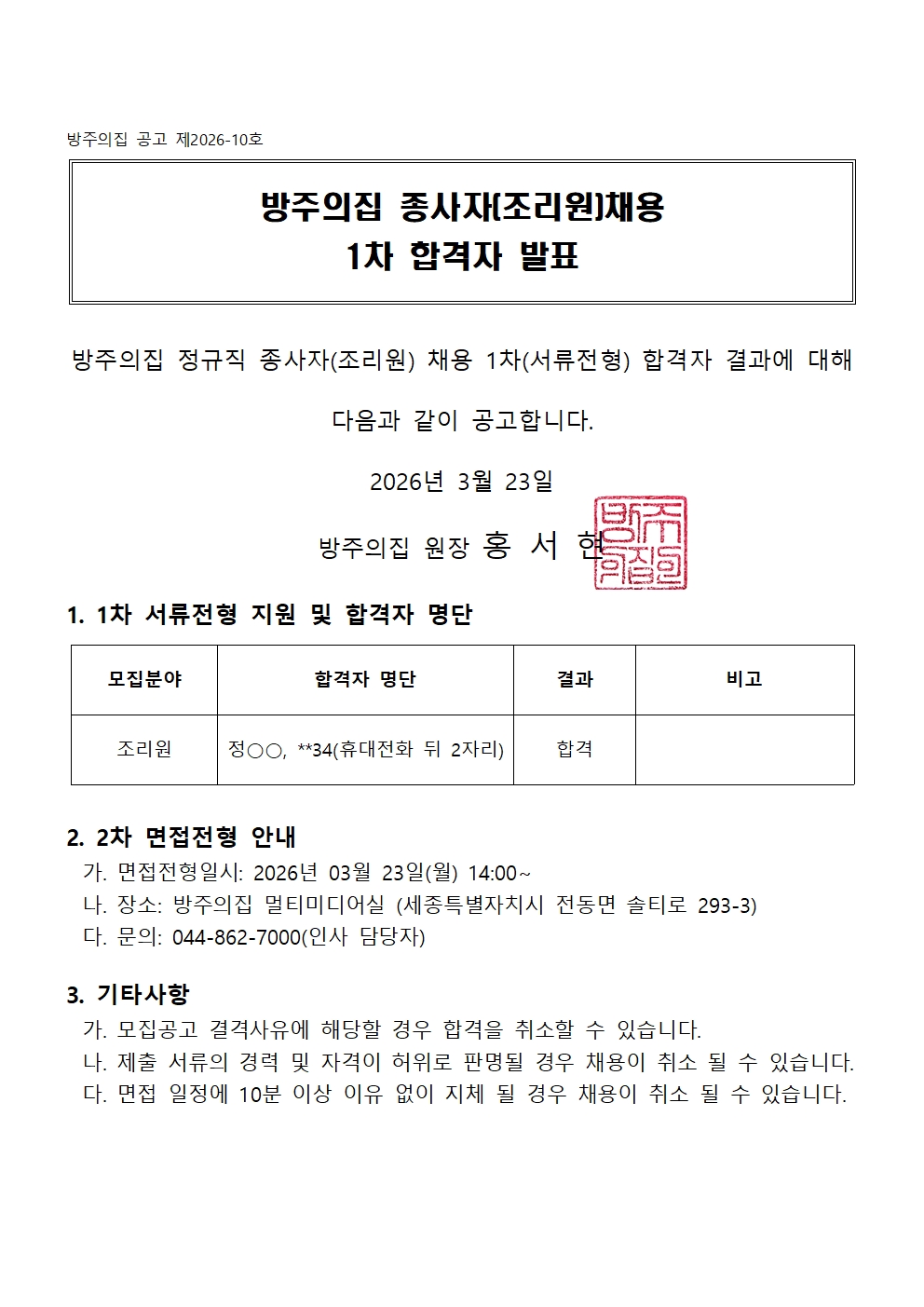 방주의집 종사자(조리원) 채용 1차 합격자 발표
