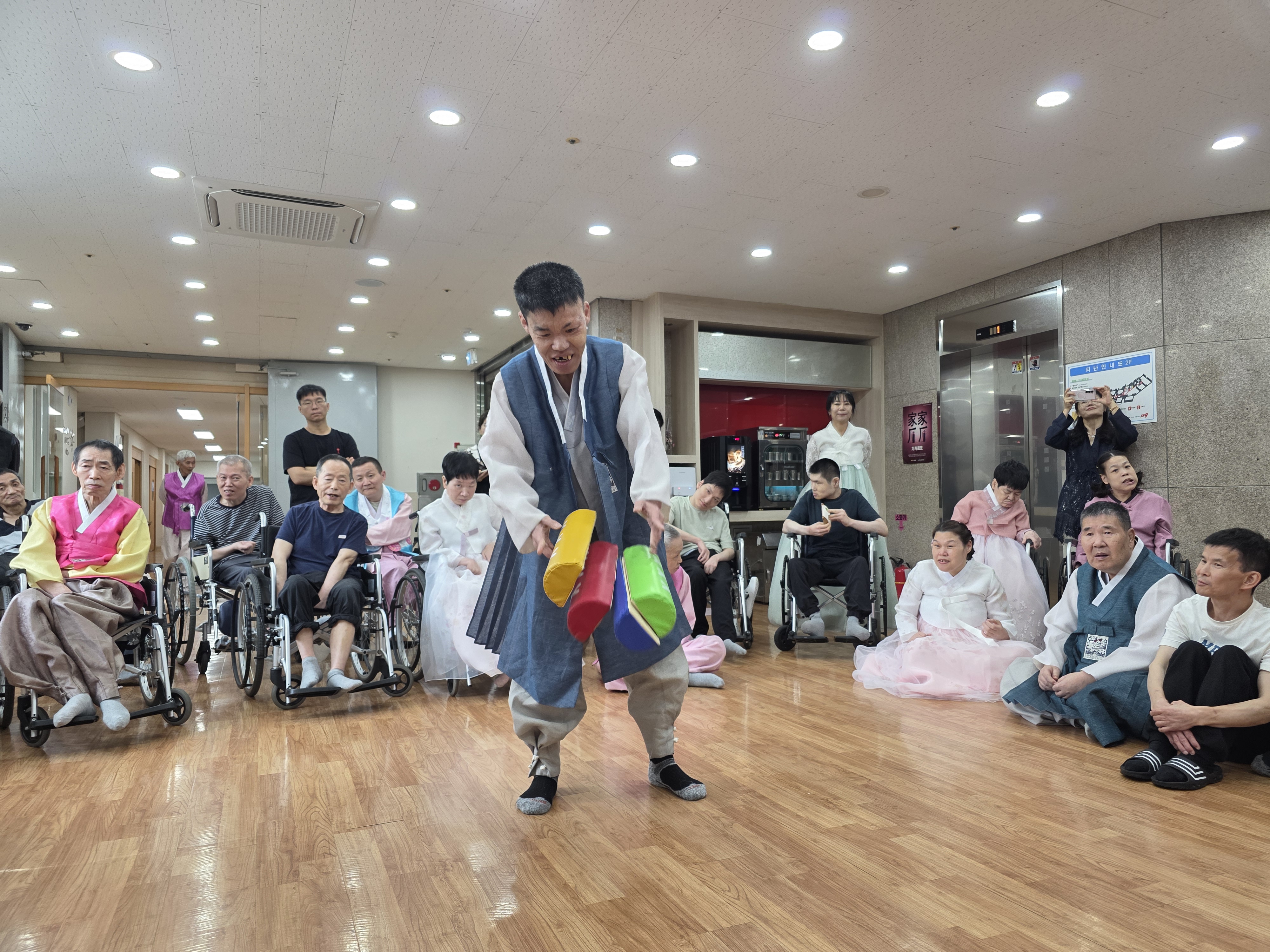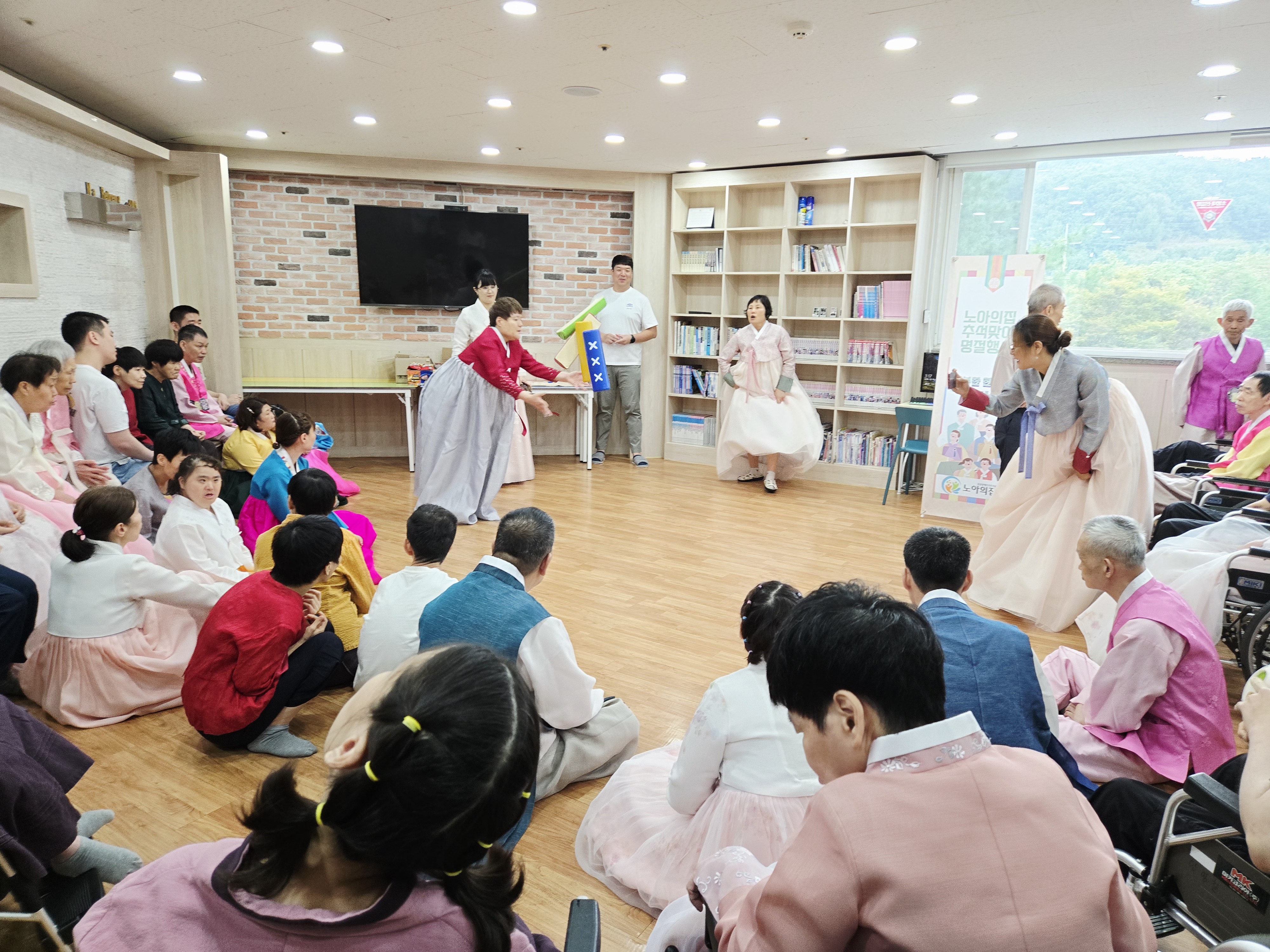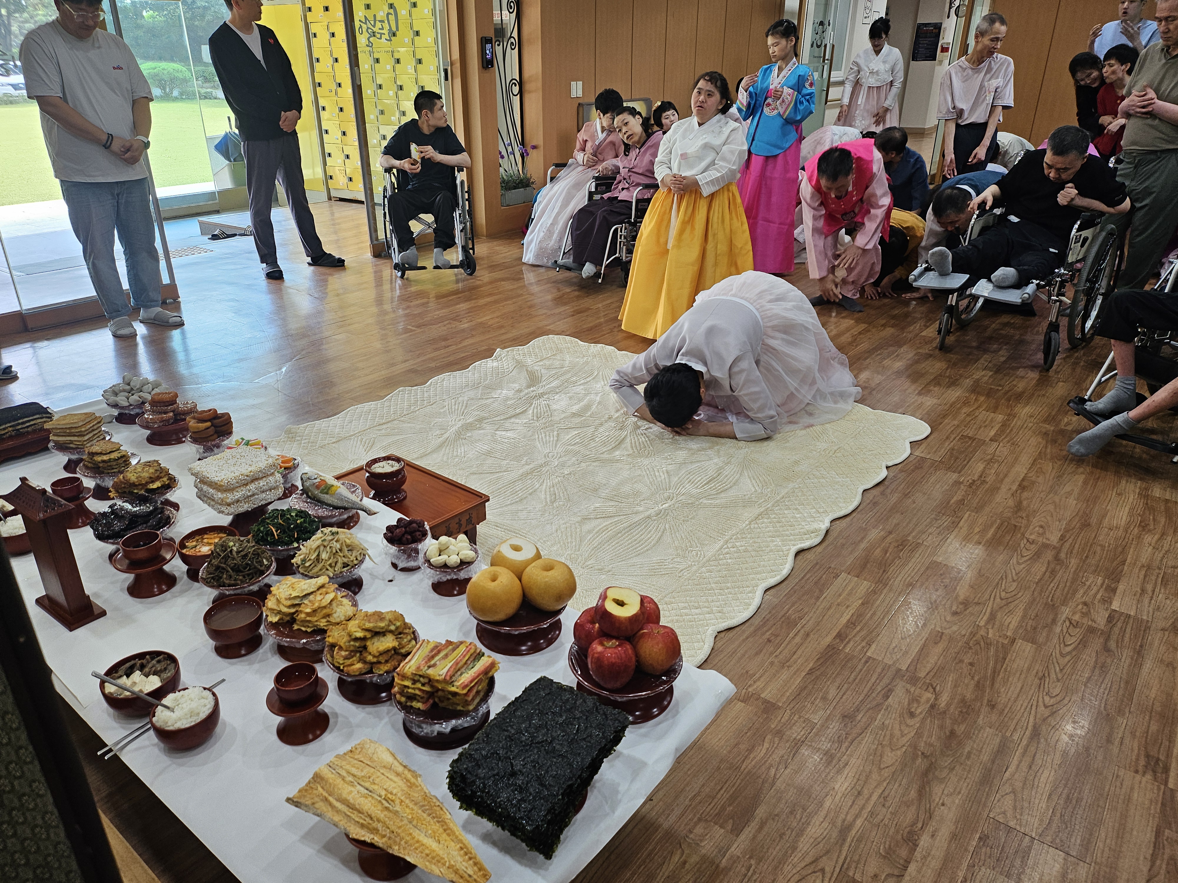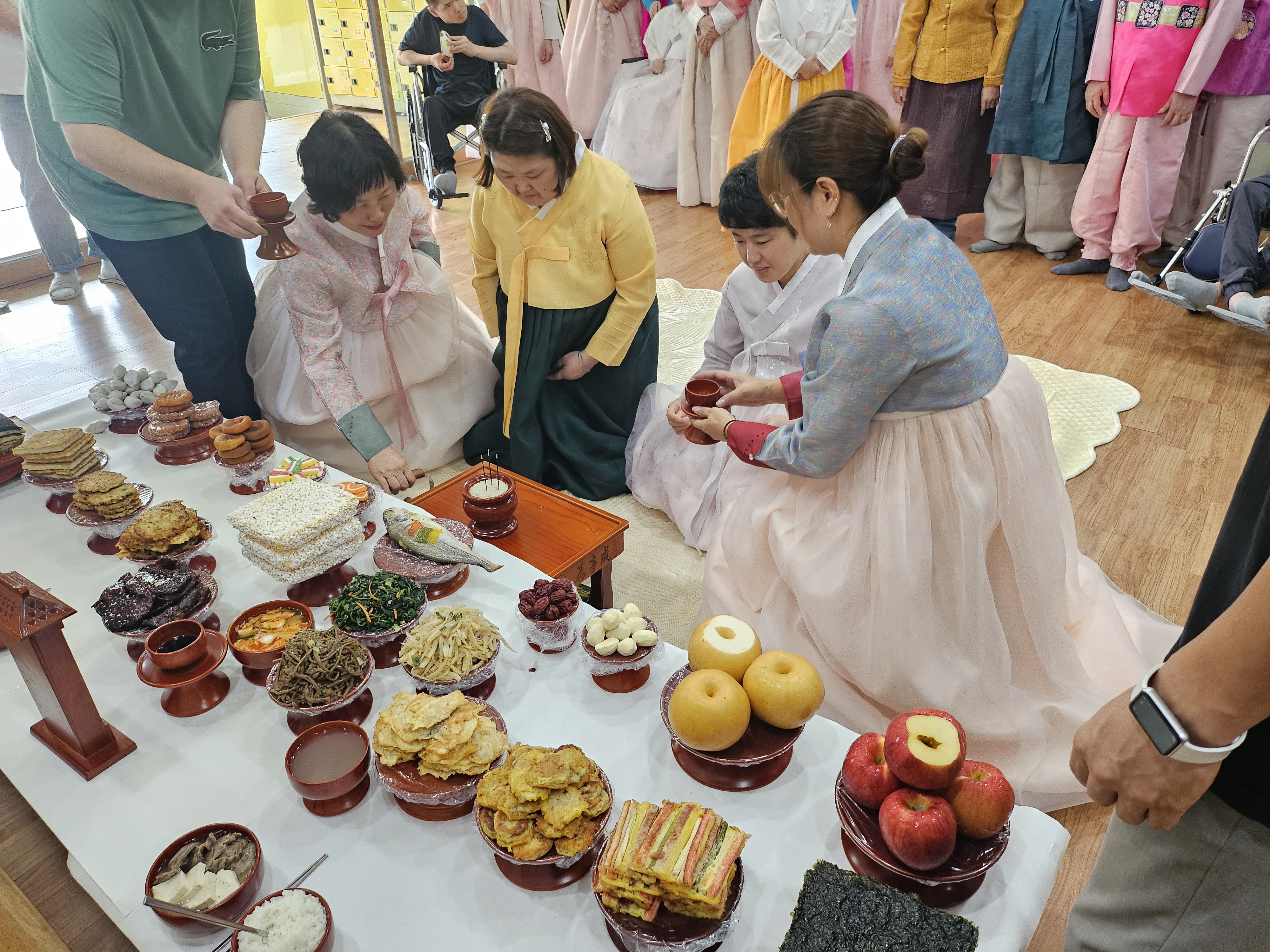형형색색의 한복을 곱게 차려입은 이용인분들께서 정성스레 차린 차례상앞에 모여