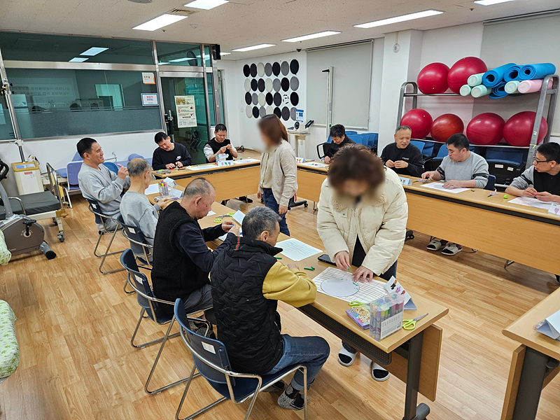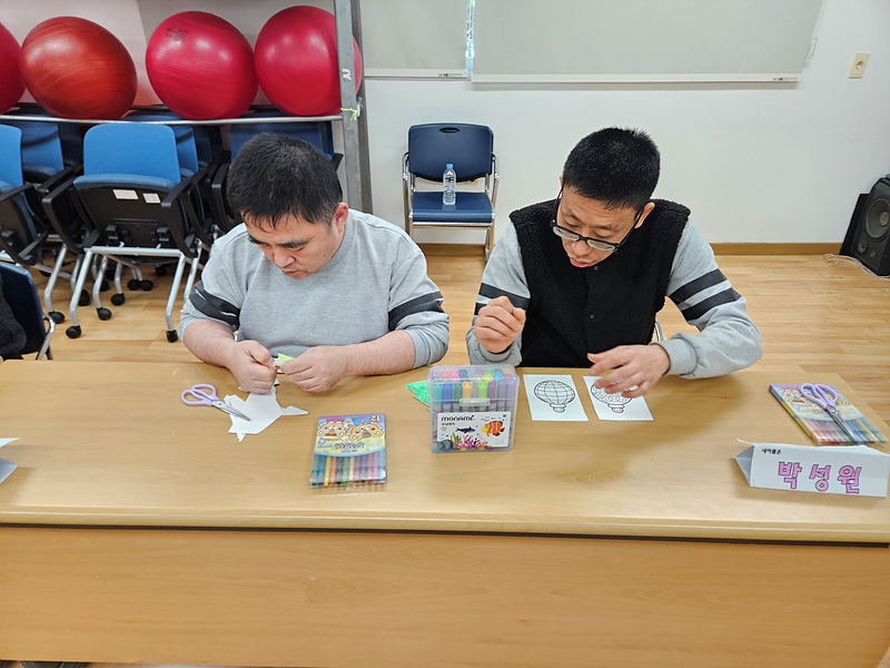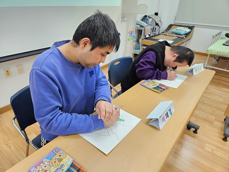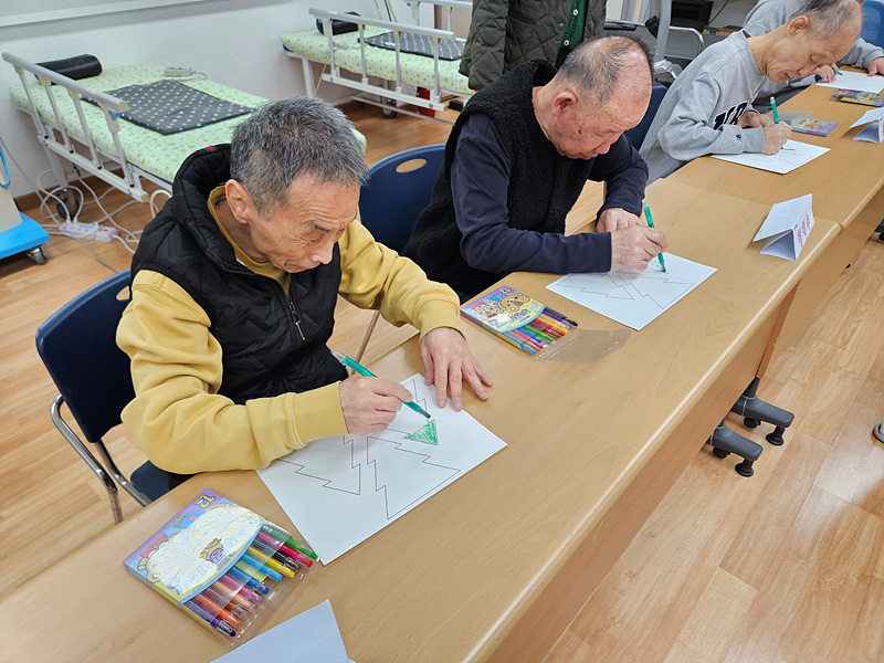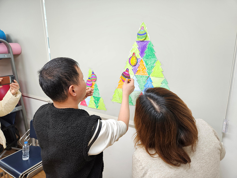 이 주제에 맞춰 첫 번째 활동으로 형형색색의 크리스마스트리를 색칠해 대형 트리로 만들어보았습니다. 참여자들은 트리 모양의 도화지를 각각 받은 뒤 색을 선택하여 색칠을 하였고, 트리를 장식하는 방울 그림에도 여러 색을 골라 채색하였습니다.