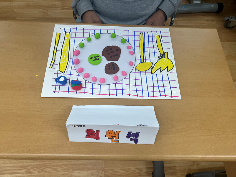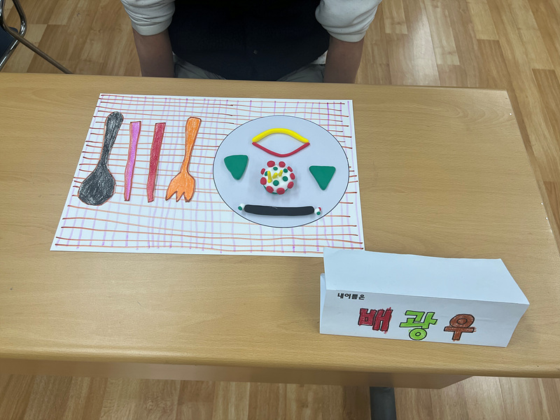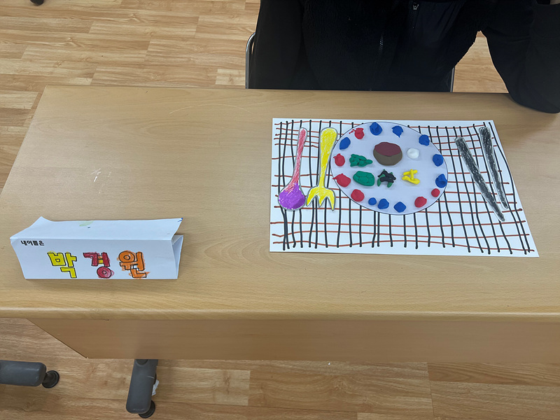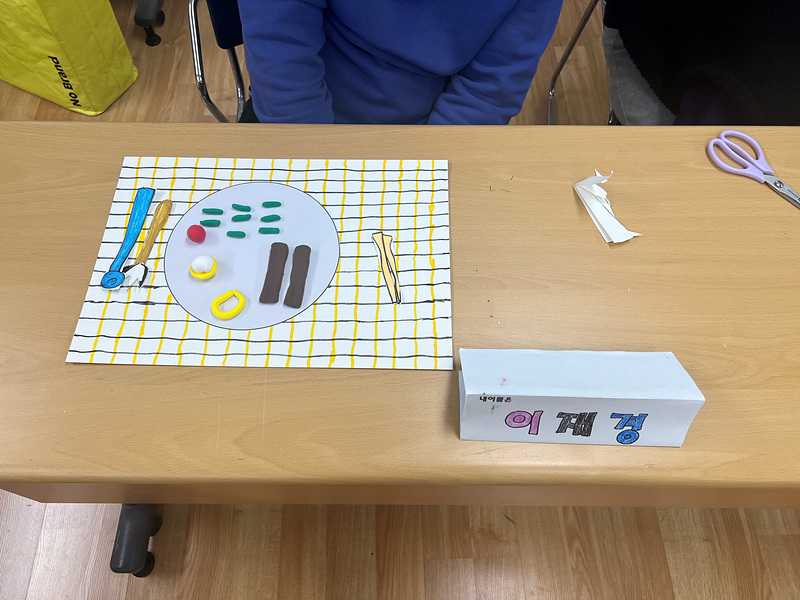 그 다음으로 그릇 위에 담긴 음식과 젓가락, 숟가락 그리고 포크를 표현하였습니다. 먼저 받침대는 선을 겹치지 않도록 여러 개를 그어 받침대를 표현하였고, 도화지를 동그랗게 잘라 그릇을 표현하였습니다. 그 위에 있는 음식들은 아이클레이로 음식을 표현하여 맛있는 음식들을 나타내보았습니다.