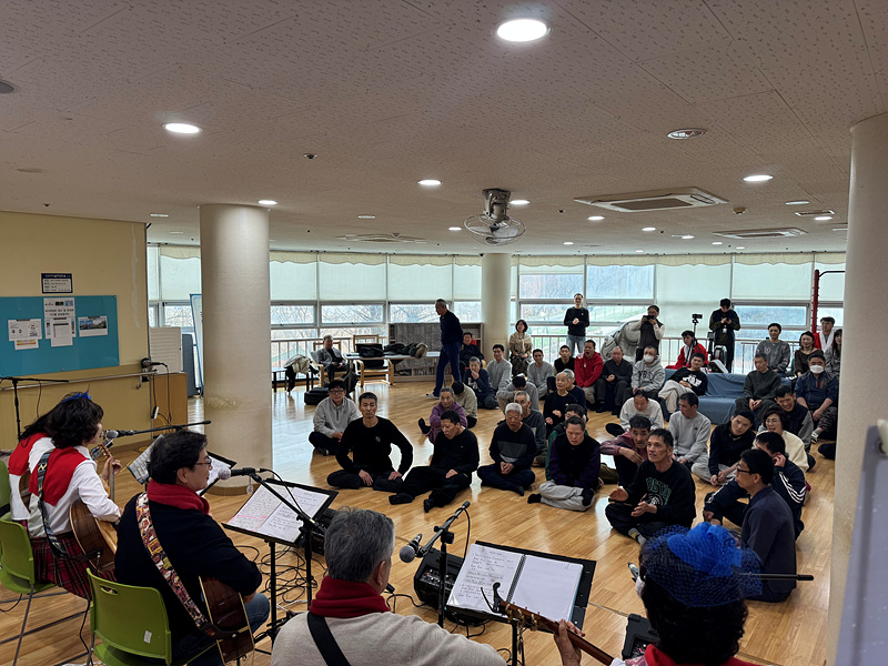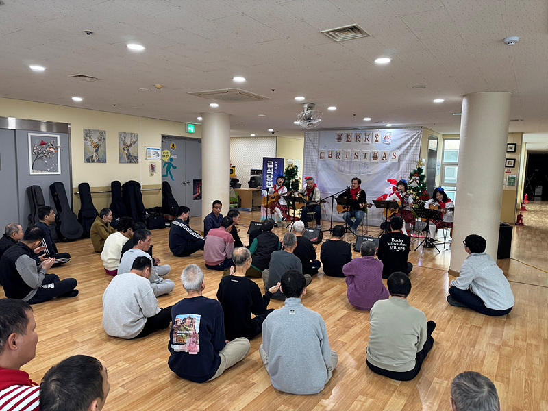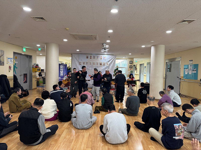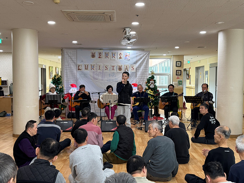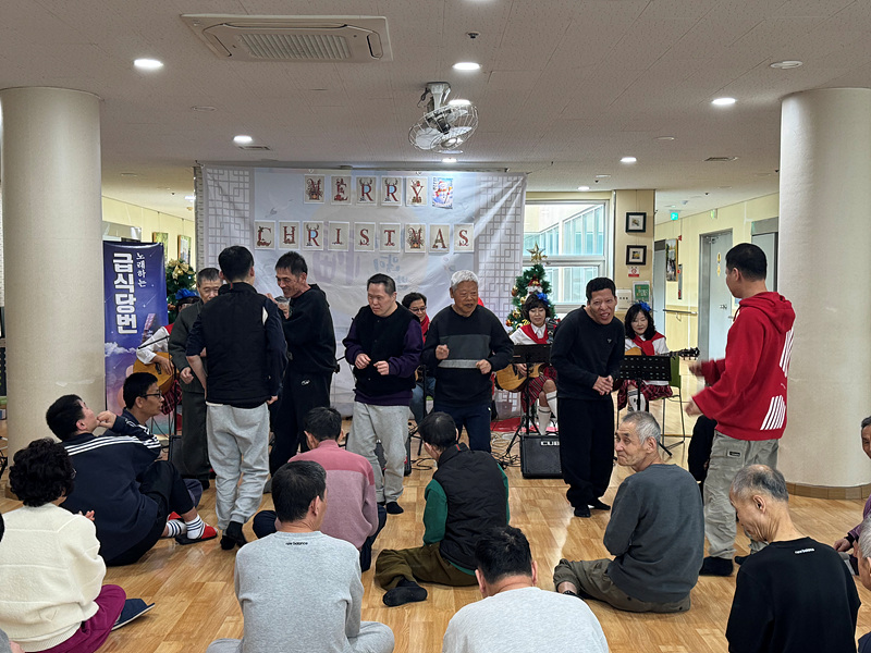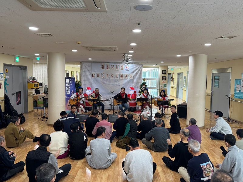 첫 번째 ‘울림’의 공연을 시작으로 본격적인 크리스마스 공연이 시작되었습니다. 기타 연주를 하면서 노래를 부르니 이용인들도 같이 박수를 치며 노래를 흥얼거리는 모습이 보였습니다.