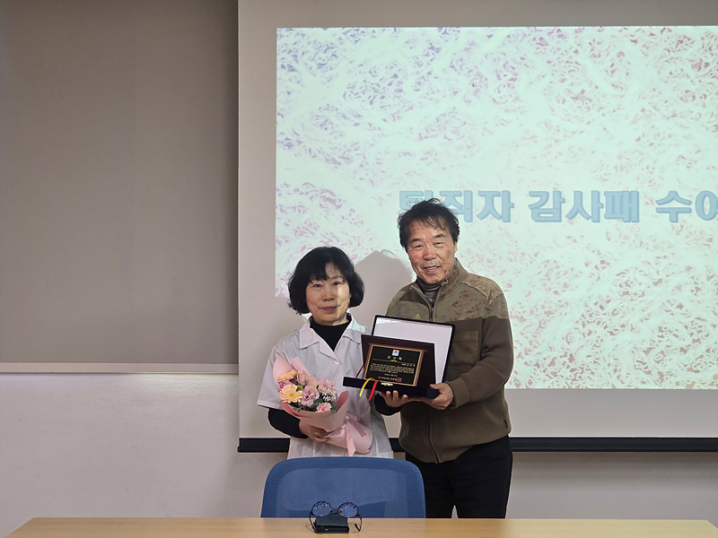 12월 31일을 마지막으로 정년 퇴임을 하시는 위생원 ‘김성숙’님에게 요나의집 전 직원들의 감사한 마음을 담아 감사패와 꽃다발을 전달하였습니다.