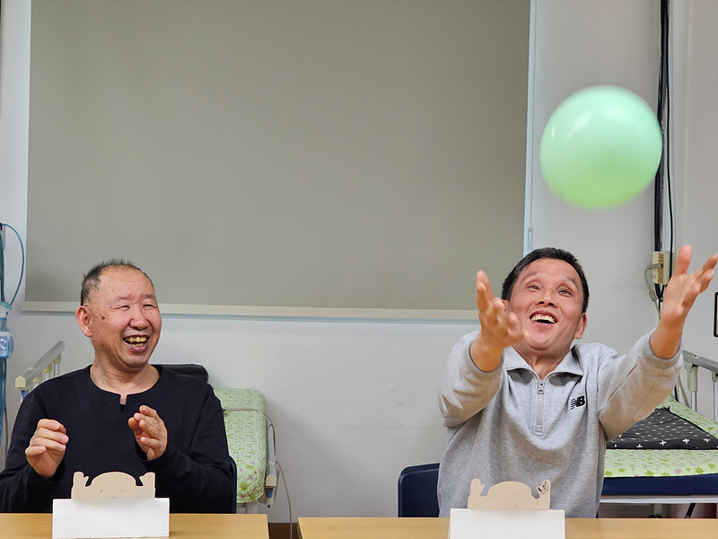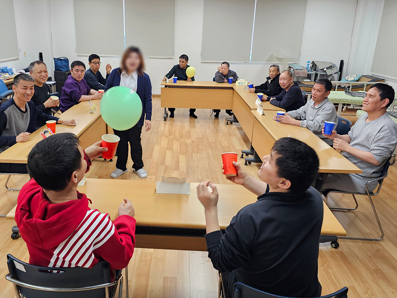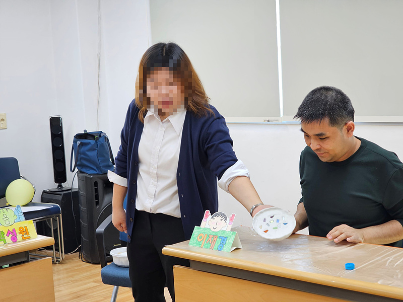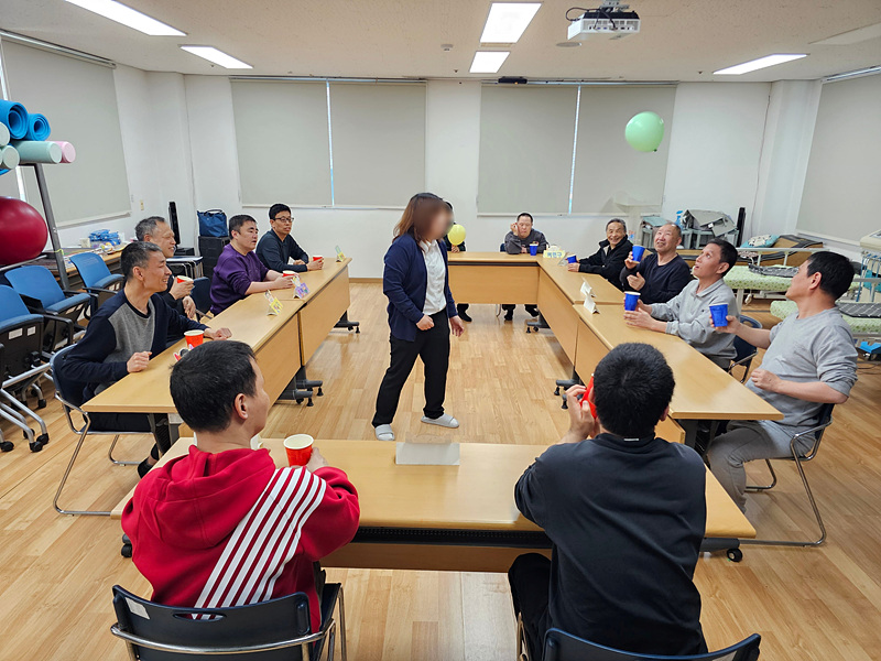 예술치료 프로그램 참여자들이 본격적인 미술 활동을 하기 전 풍선을 이용한 간단한 활동을 하였습니다. 참여자들이 서로 돌아가면서 풍선을 컵으로 옆 사람에게 넘겨 잡아보는 활동을 하였는데 참여자들이 매우 행복하게 웃으면서 참여하는 모습이 보였습니다.