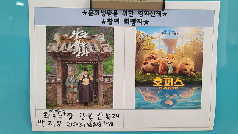 영화가 시작되자 모두 집중하여 관람하였고, 재미있는 장면에서는 웃음이 터져 나오고 감동적인 장면에서는 서로 공감하는 모습도 보였습니다. 영화를 관람한 후에는 서로 영화에 대한 이야기를 나누며 즐거운 시간을 보냈습니다.