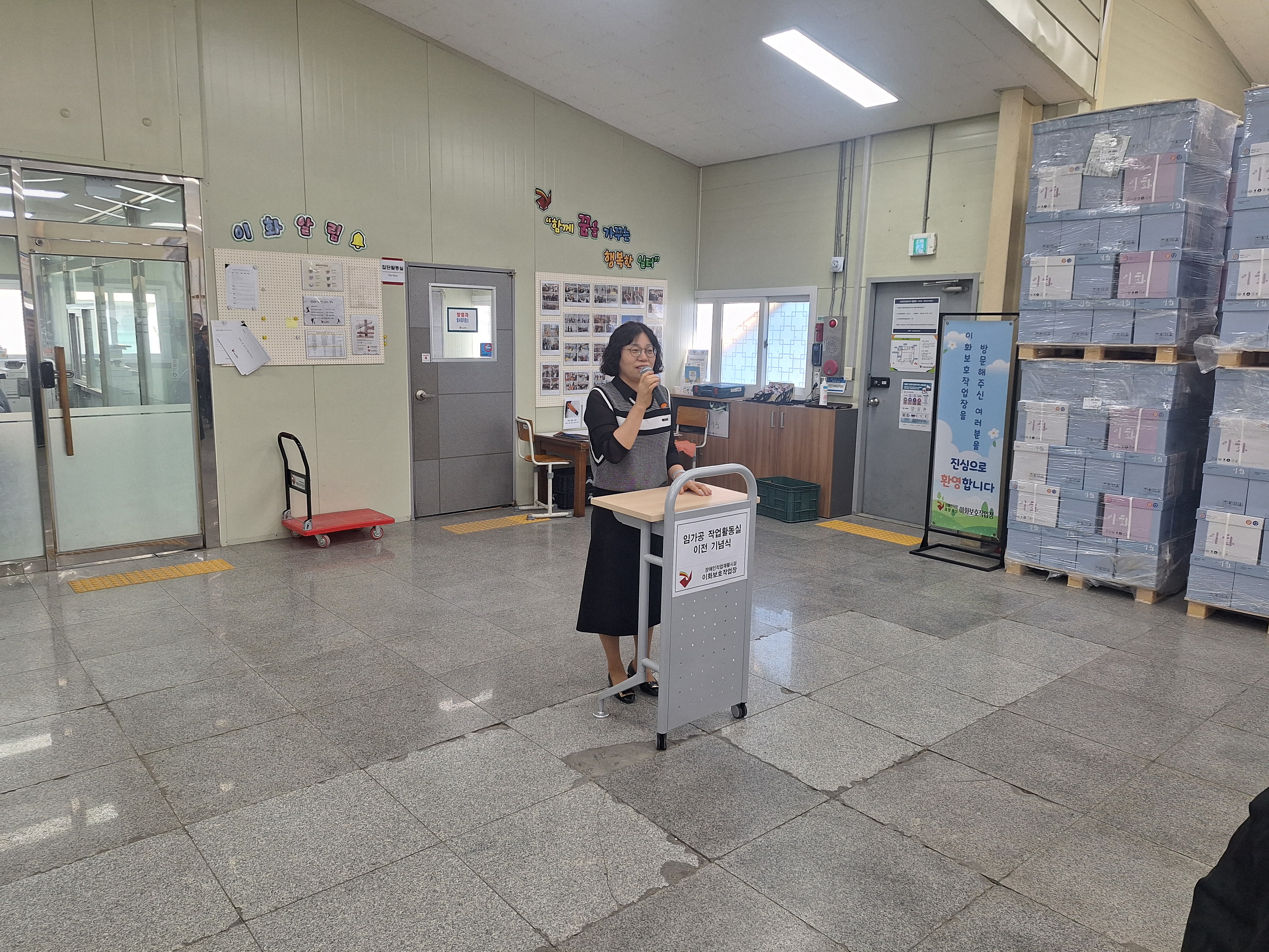내 용 : 이화보호작업장에서는 임가공 작업활동실 이전을 기념하여 기념식을 진행하였습니다. 이번 작업활동실 분리는 이용인들이 보다 쾌적한 환경에서 안정적으로 작업에 참여하고 작업에 더욱 집중할 수 있도록 하기 위해 이루어졌습니다.