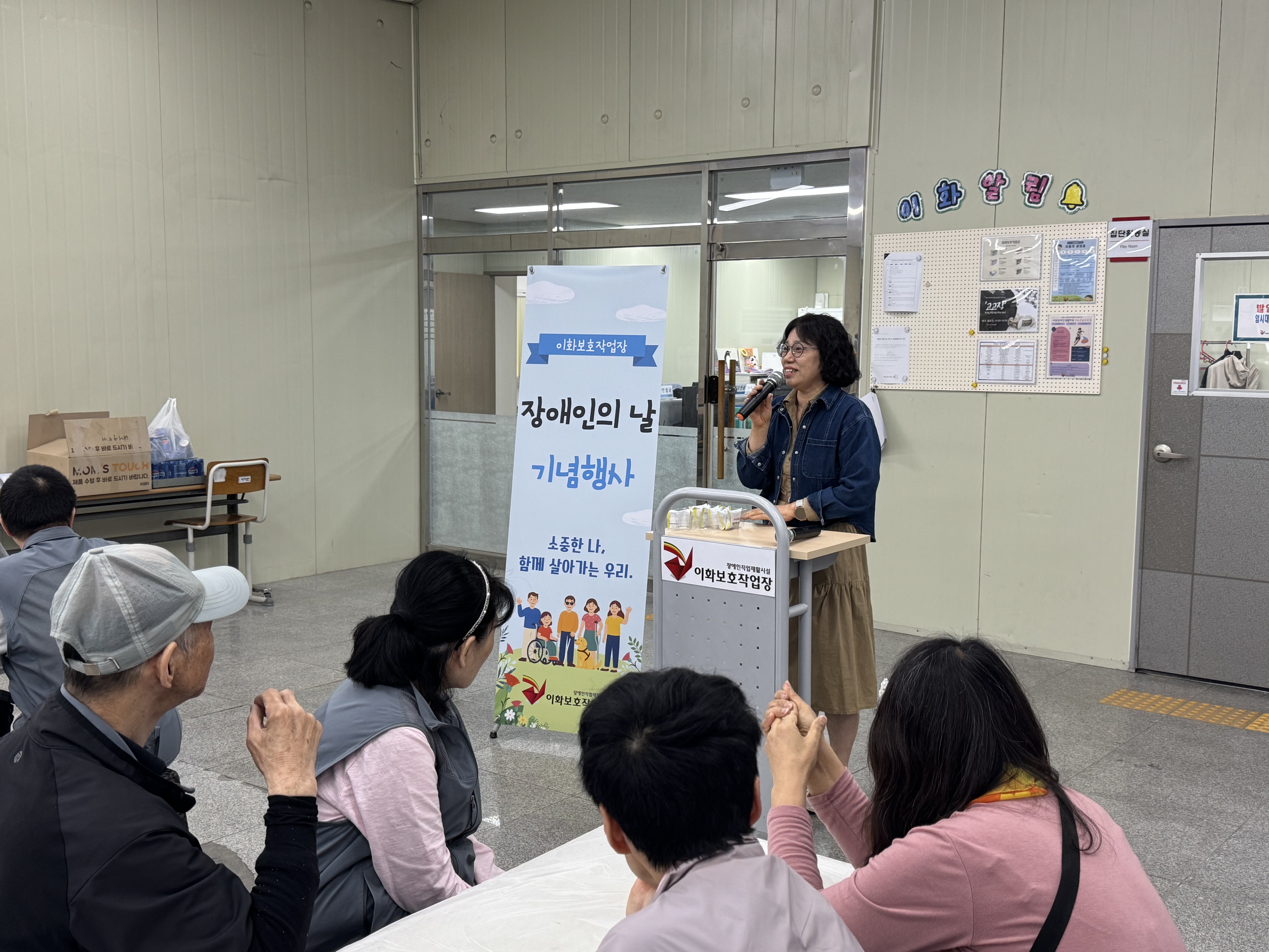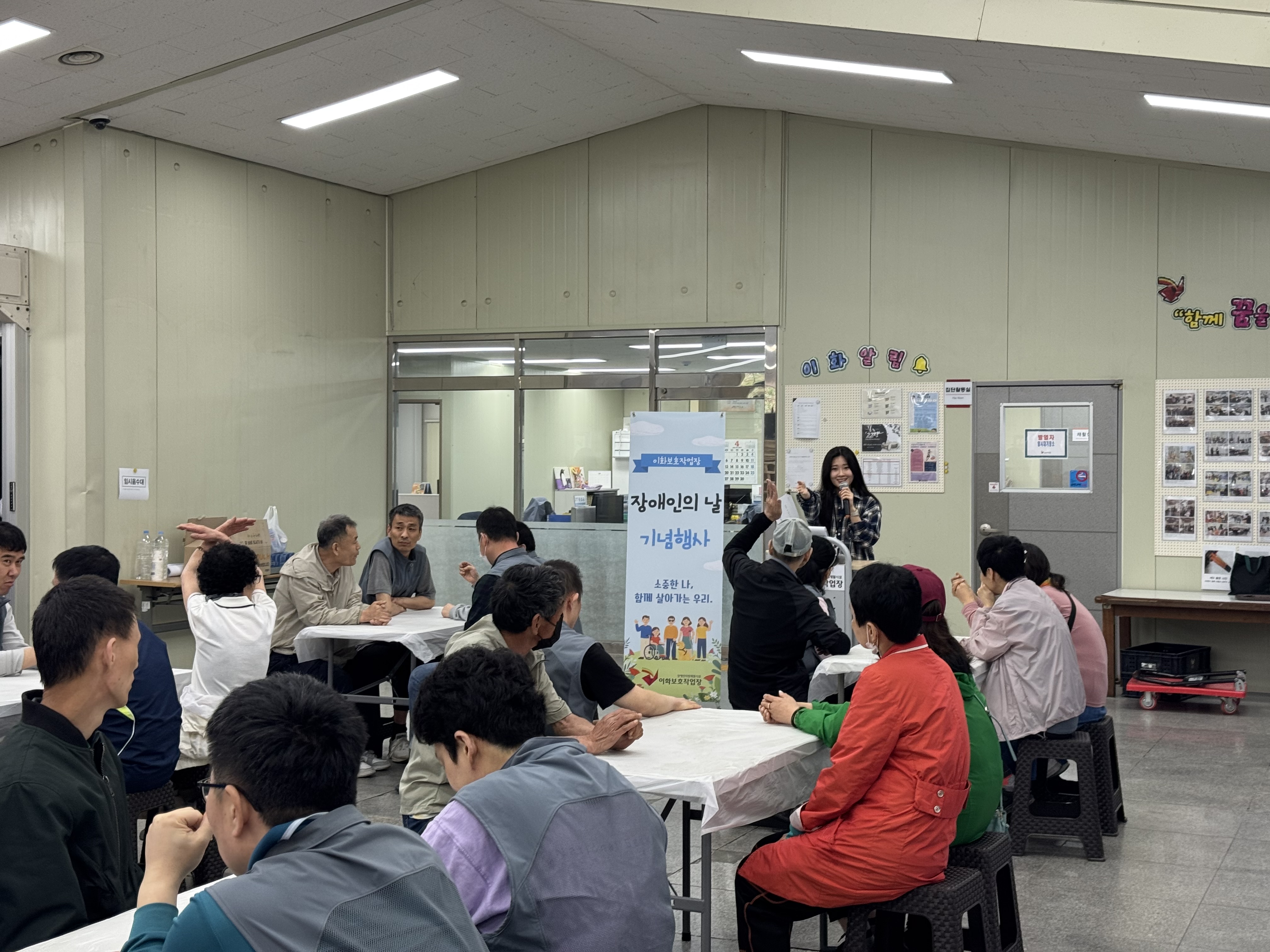 내 용 : 우리 작업장에서는 4월 20일 장애인의 날을 맞아 이용인분들과 함께 의미 있는 시간을 보내고자 기념행사를 진행하였습니다. 이번 행사는 장애인의 날의 의미를 함께 나누고 서로를 존중하며 함께 살아가는 가치를 되새기기 위해 마련되었습니다.