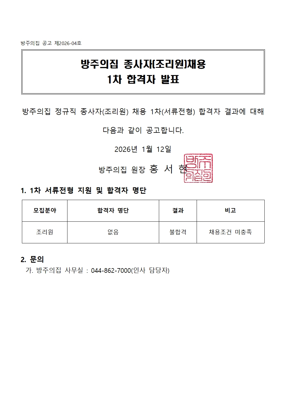 방주의집 종사자(조리원) 채용 1차 합격자 발표