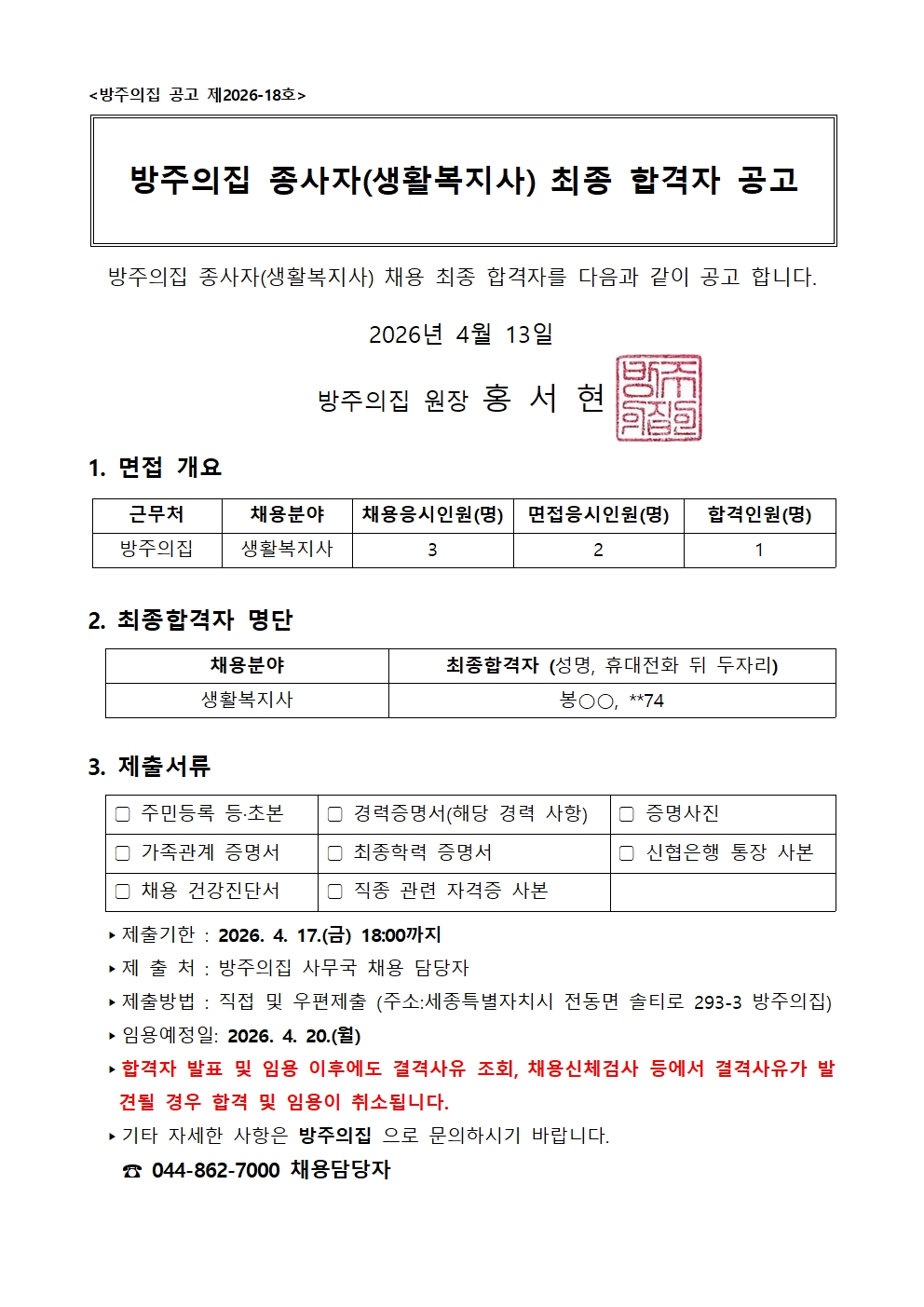 방주의집 종사자(생활복지사) 공개 채용 최종합격자 결과 발표