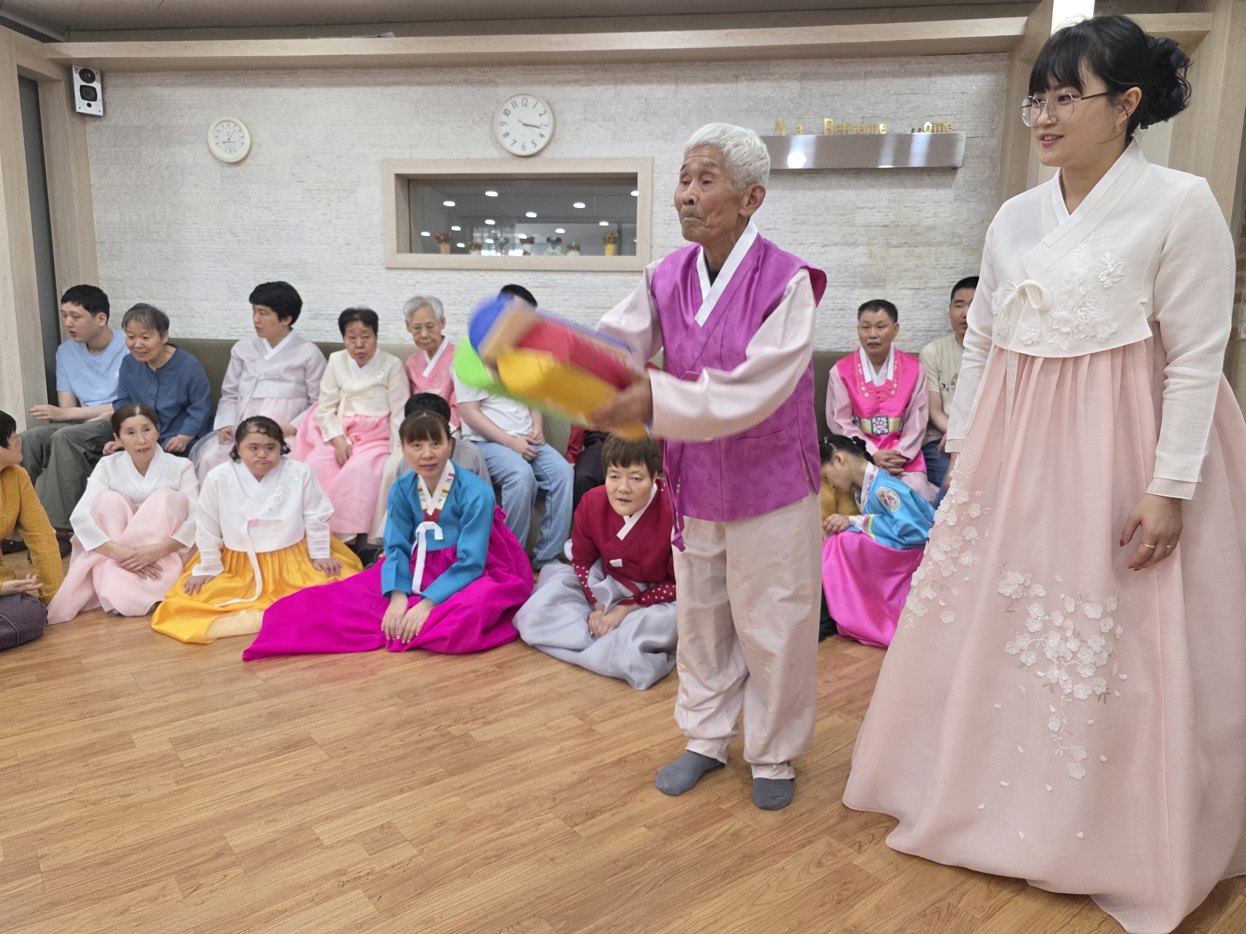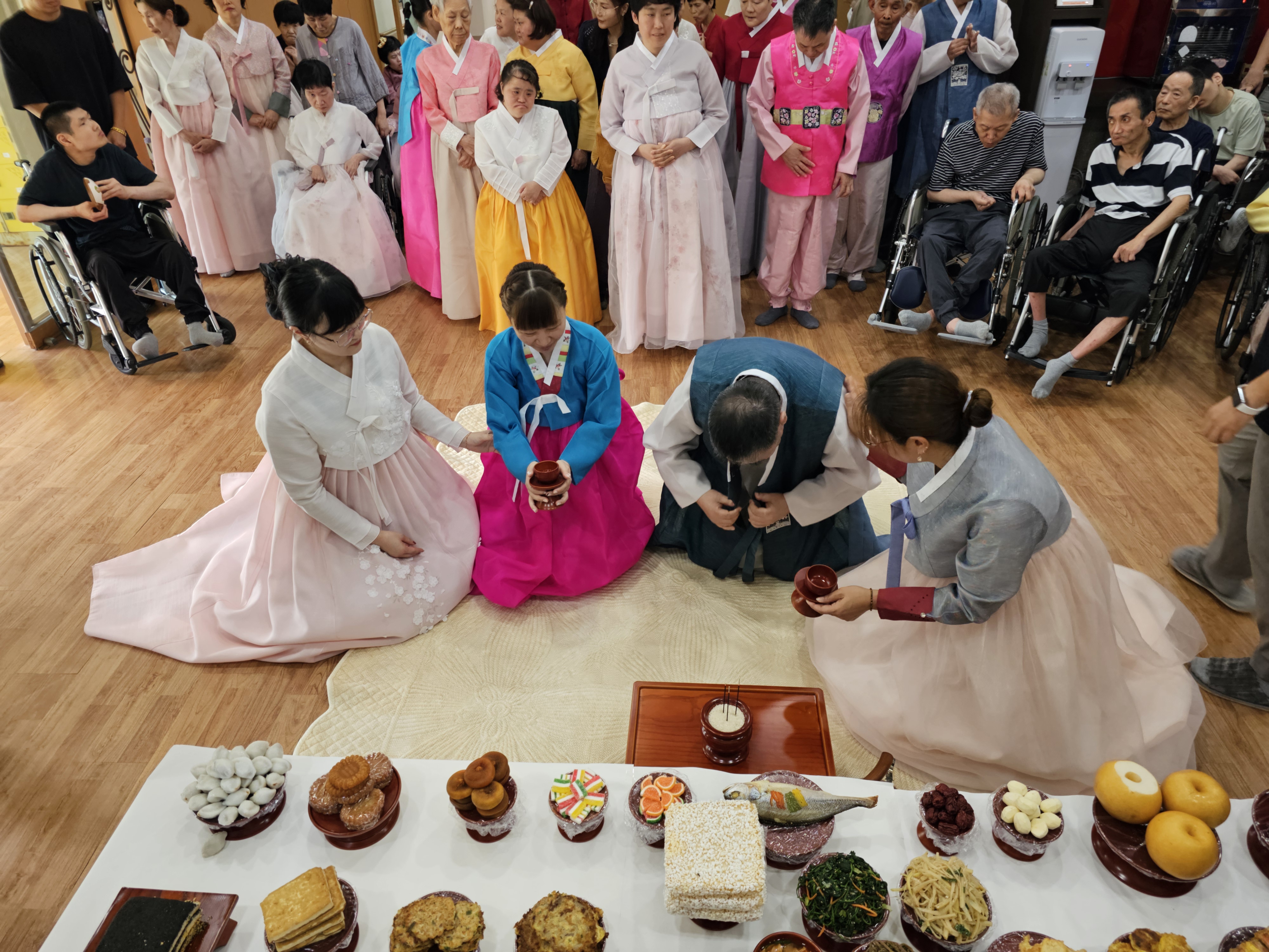 형형색색의 한복을 곱게 차려입은 이용인분들께서 정성스레 차린 차례상앞에 모여