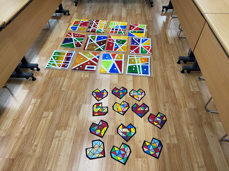 또한, 하트 모양의 셀로판지에 삼각형 모양으로 색종이를 잘라 각자 자기만의 색 조합으로 하트를 완성하였습니다.