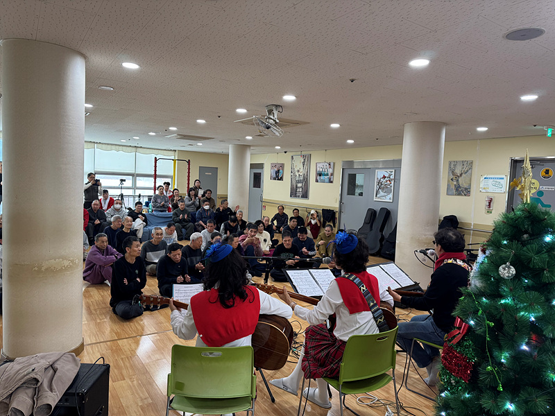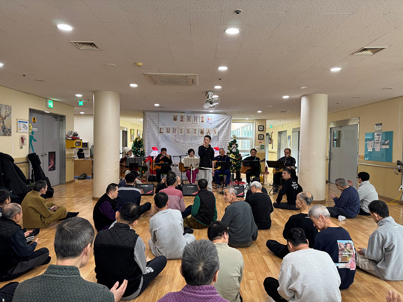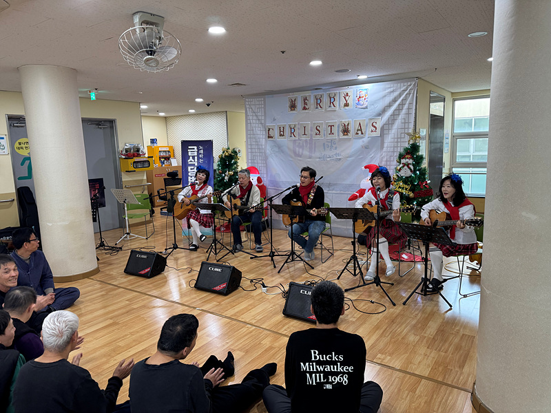 첫 번째 ‘울림’의 공연을 시작으로 본격적인 크리스마스 공연이 시작되었습니다. 기타 연주를 하면서 노래를 부르니 이용인들도 같이 박수를 치며 노래를 흥얼거리는 모습이 보였습니다.