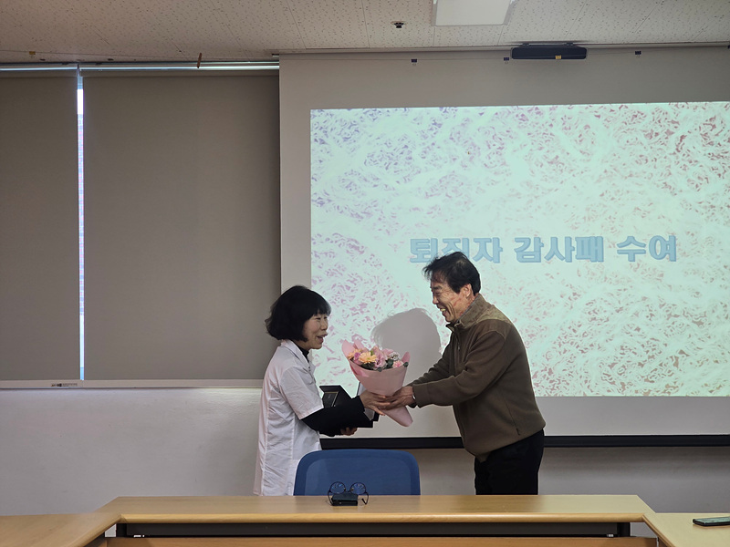 12월 31일을 마지막으로 정년 퇴임을 하시는 위생원 ‘김성숙’님에게 요나의집 전 직원들의 감사한 마음을 담아 감사패와 꽃다발을 전달하였습니다.