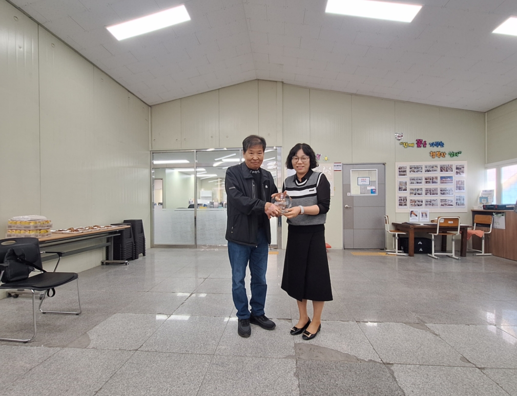기념식은 원장님의 인사말씀을 시작으로 공로패 수여와 다과회 순으로 진행되었습니다. 특히 공로패는 오랜 기간 작업장을 성실하게 이용한 이용인의 퇴소를 앞두고 그동안의 노고에 대한 감사의 마음을 담아 수여되었습니다. 해당 이용인은 작업장을 이용하는 동안 성실한 자세와 책임감으로 타의 모범이 되었으며 밝고 긍정적인 모습으로 공동체에 기여한 공로를 인정받아 더욱 의미 있는 시간이 되었습니다. 이후 다과회를 통해 이용인들과 함께 이야기를 나누며 따뜻한 분위기 속에서 기념식을 마무리하였습니다.